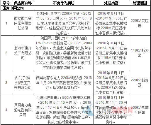 2016年8月,國家電網(wǎng)及其各省電力公司發(fā)布了關(guān)于供應(yīng)商不良行為處理情況的通報(bào)公告,依據(jù)《國家電網(wǎng)公司供應(yīng)商不良行為處理管理細(xì)則》的有關(guān)規(guī)定,對(duì)出現(xiàn)產(chǎn)品質(zhì)量問題、履約不誠信等問題的供應(yīng)商進(jìn)行了處理。部分名單如下。